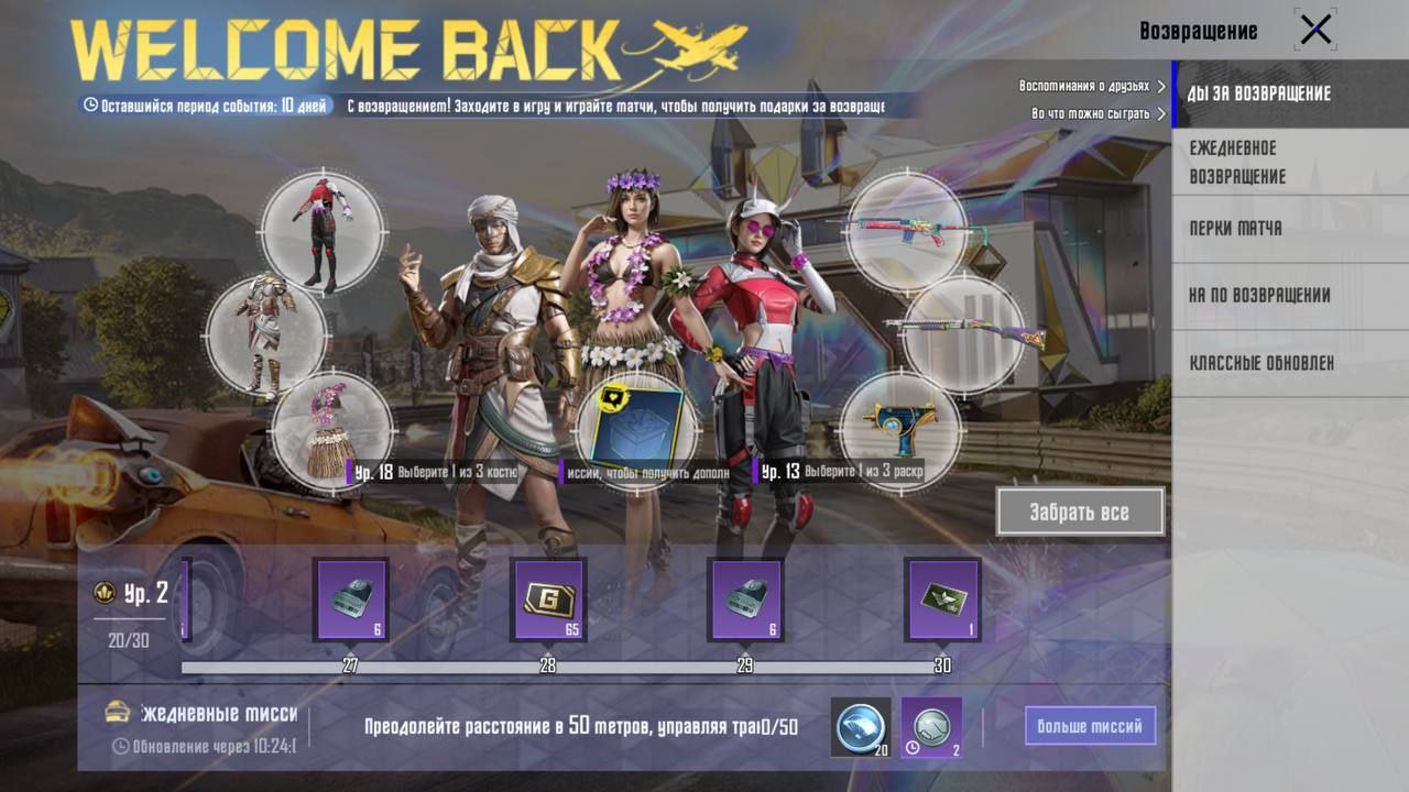 Награды которые можно получить при возвращении в игру (не заходить больше недели если не было изменений)